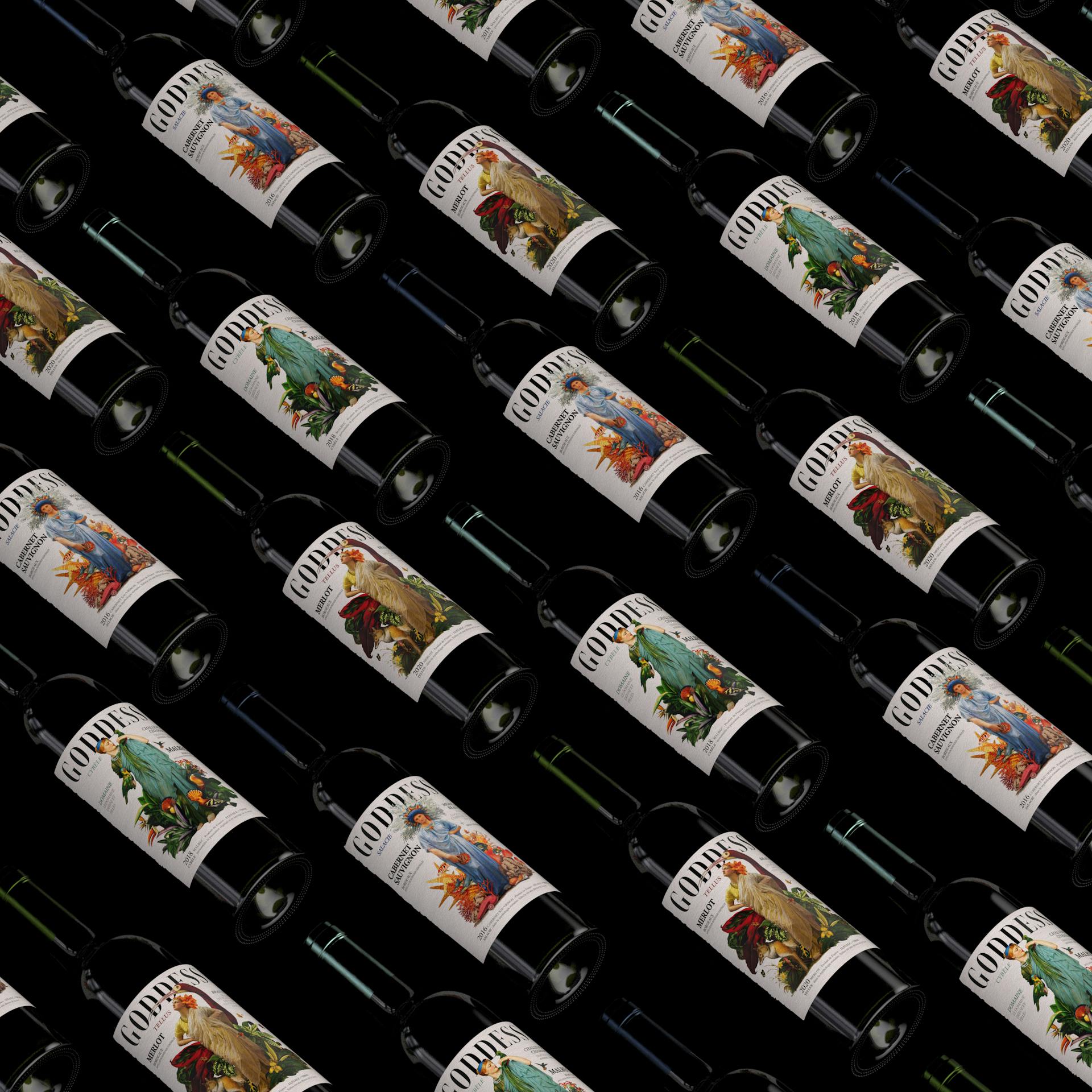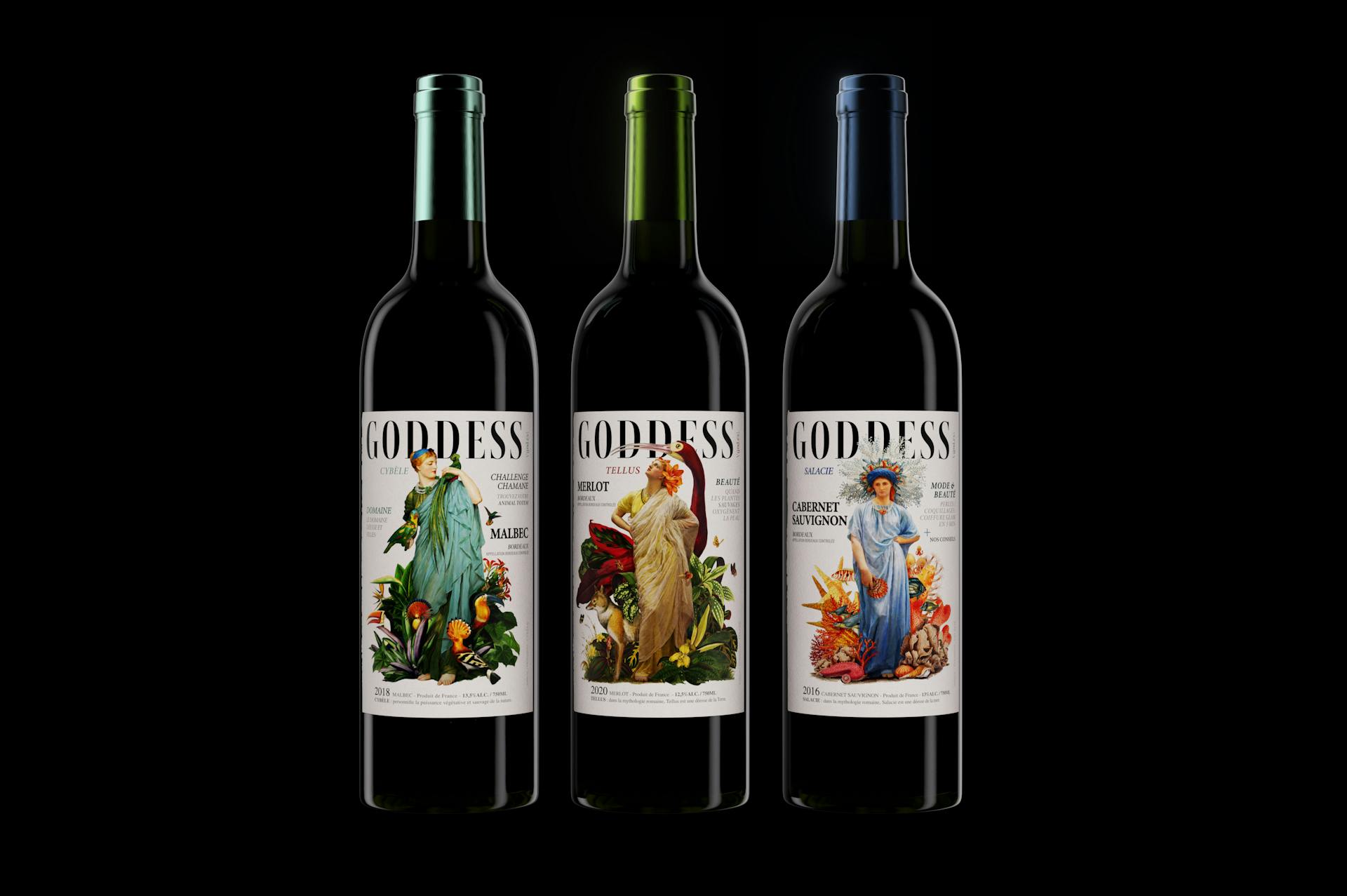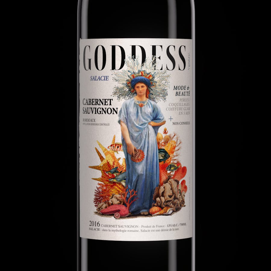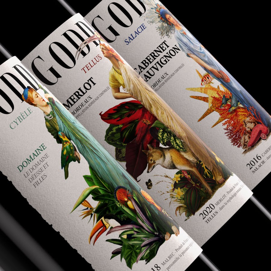 Creation of an expressive graphic universe dedicated to the goddesses of Roman mythology. The Goddess wines ("Goddess") highlight the emblematic grape varieties of the Bordeaux wine region, breaking traditional codes with a contemporary and impactful design.