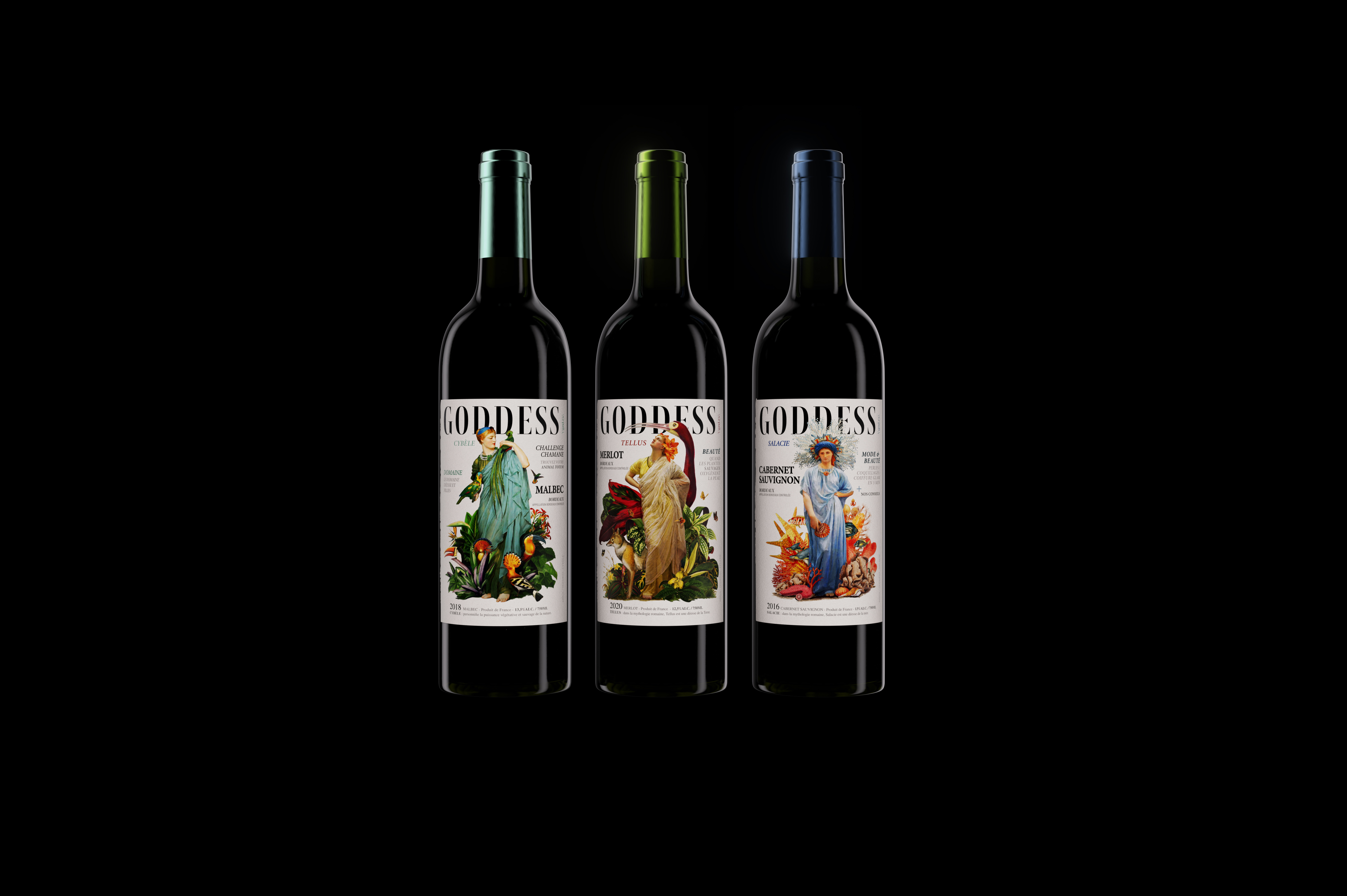 Creation of an expressive graphic universe dedicated to the goddesses of Roman mythology. The Goddess wines ("Goddess") highlight the emblematic grape varieties of the Bordeaux wine region, breaking traditional codes with a contemporary and impactful design.