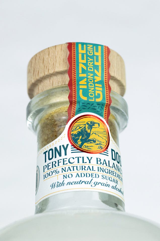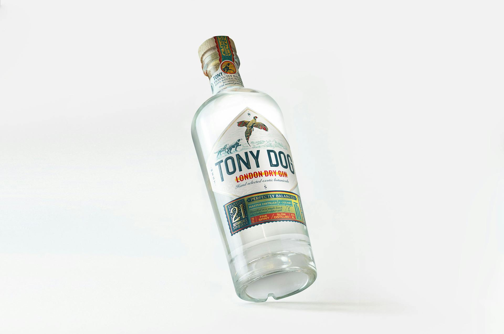 Just like the aromas of Tony Dog gin, the graphic composition is balanced and structured. The upper part of the label depicts a hunting scene, while the lower part contains the technical information of the spirit. The rich and saturated colors of the label give the whole a modern and contemporary look.