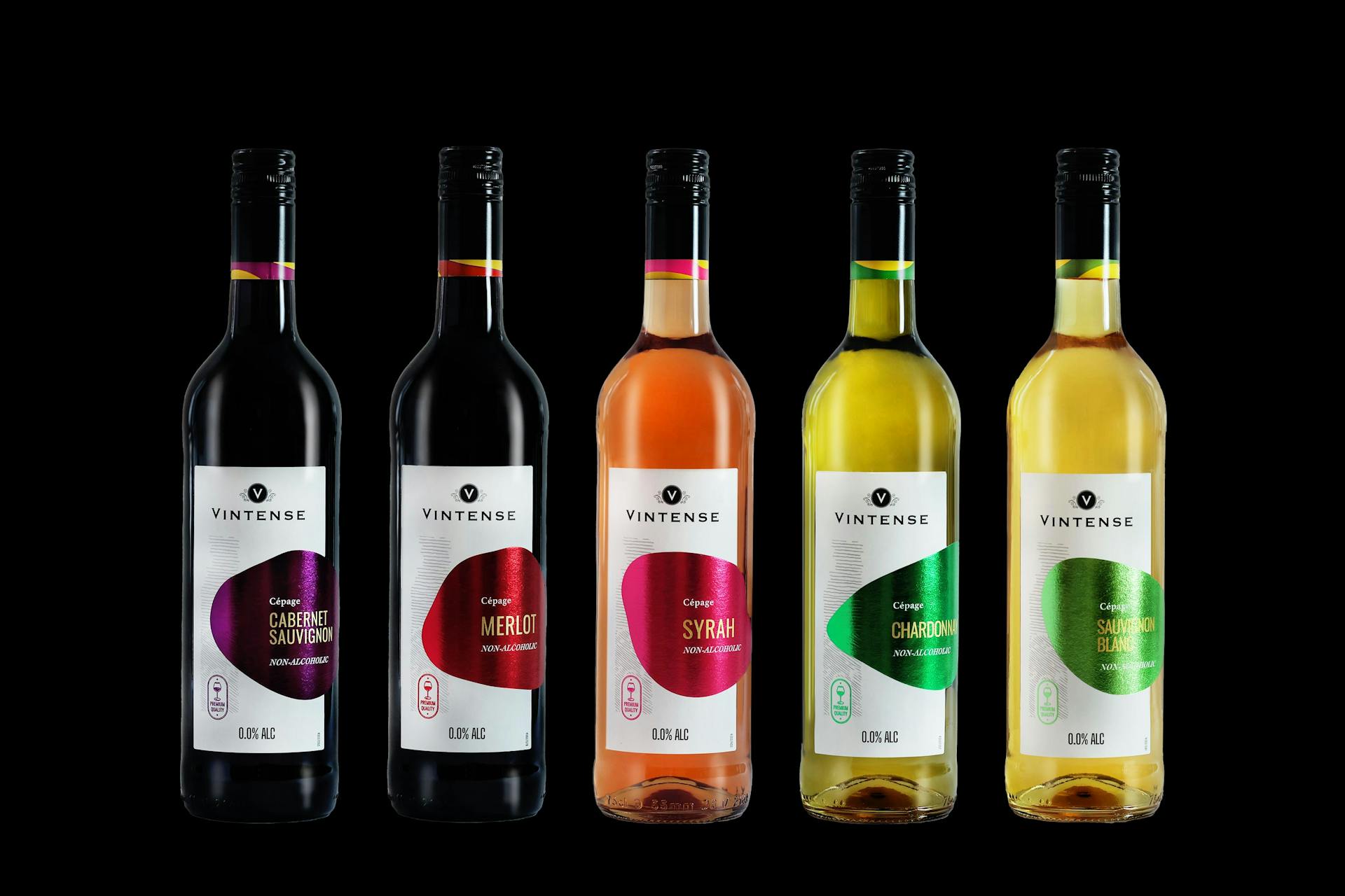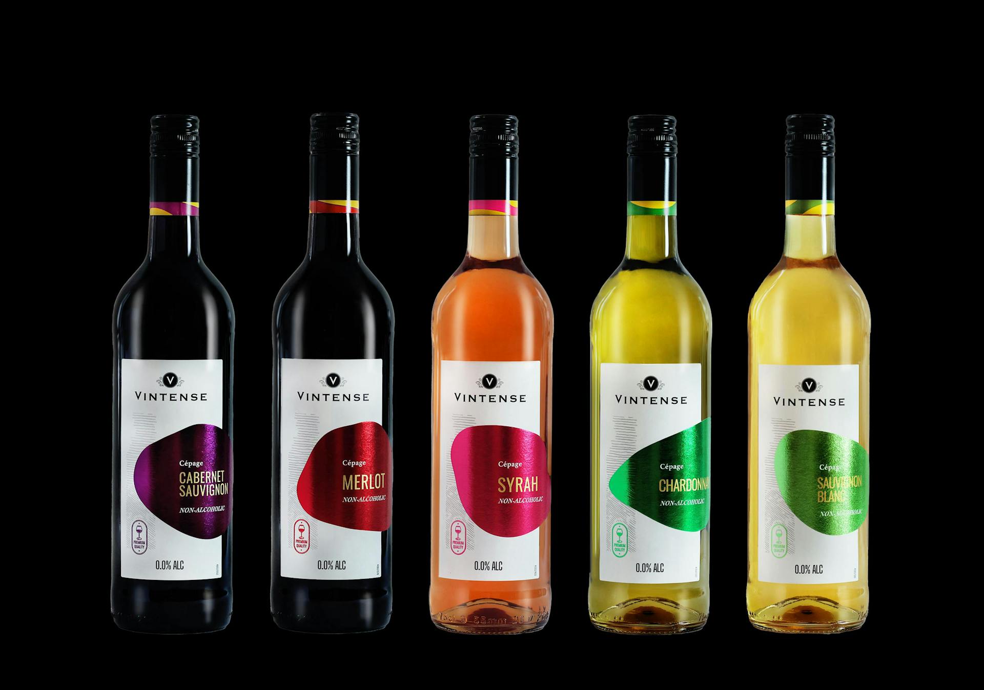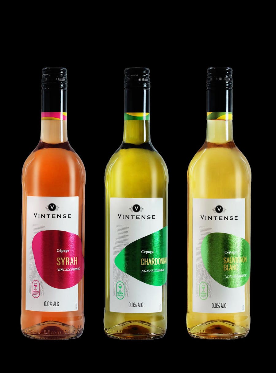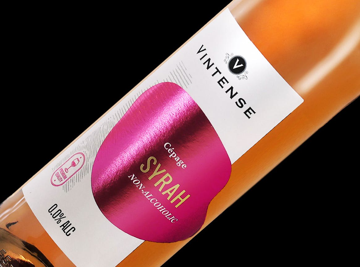 For the Vintense alcohol-free wine range, we designed labels that capture the essence of the product through a unique and evocative graphic language.