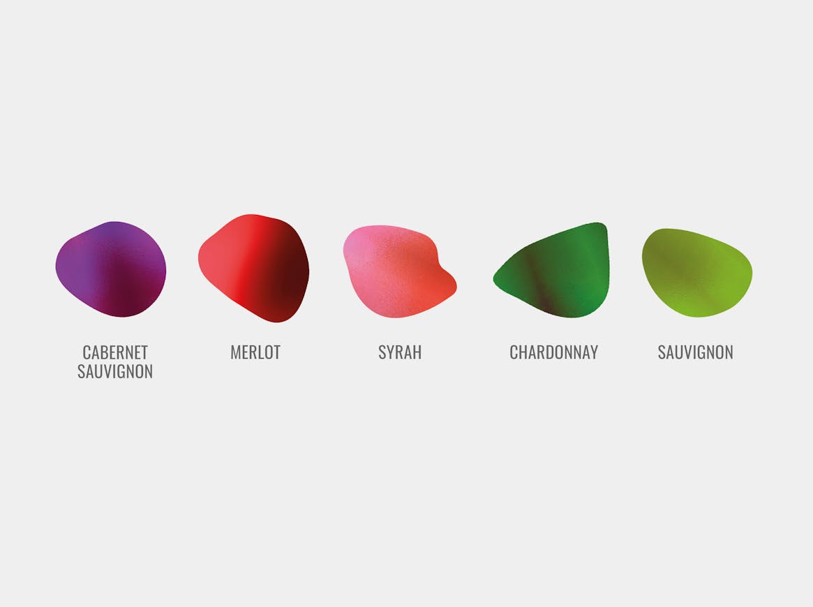 Through abstract shapes, we crafted a unique composition that visually evokes the olfactory notes and complex aromas of each wine. Each shape and hue has been carefully chosen to represent the unique feel of each grape variety: shades of fruit, floral hints, and woody accents unfold, inviting a one-of-a-kind sensory exploration.