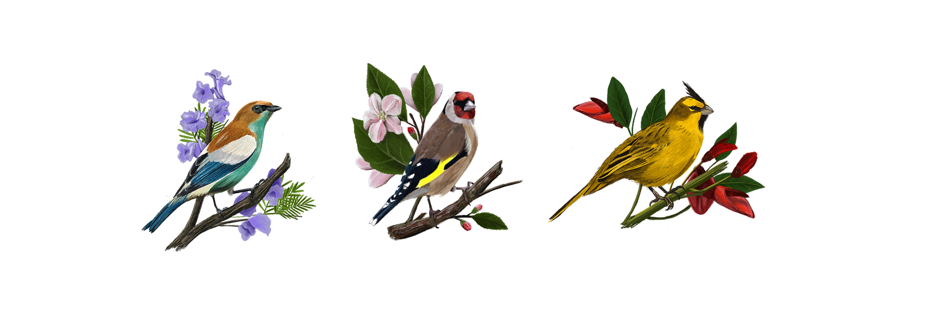 On y trouve au premier plan de ces compositions graphiques trois illustrations d’oiseau sur une branche, au traité volontairement naïf et reprenant le style graphique des tentures murales et/ou des papiers peints inspiré des années 70. Au second plan, on retrouve un motif utilisé pour rehausser et trancher avec le dessin sensible des oiseaux.